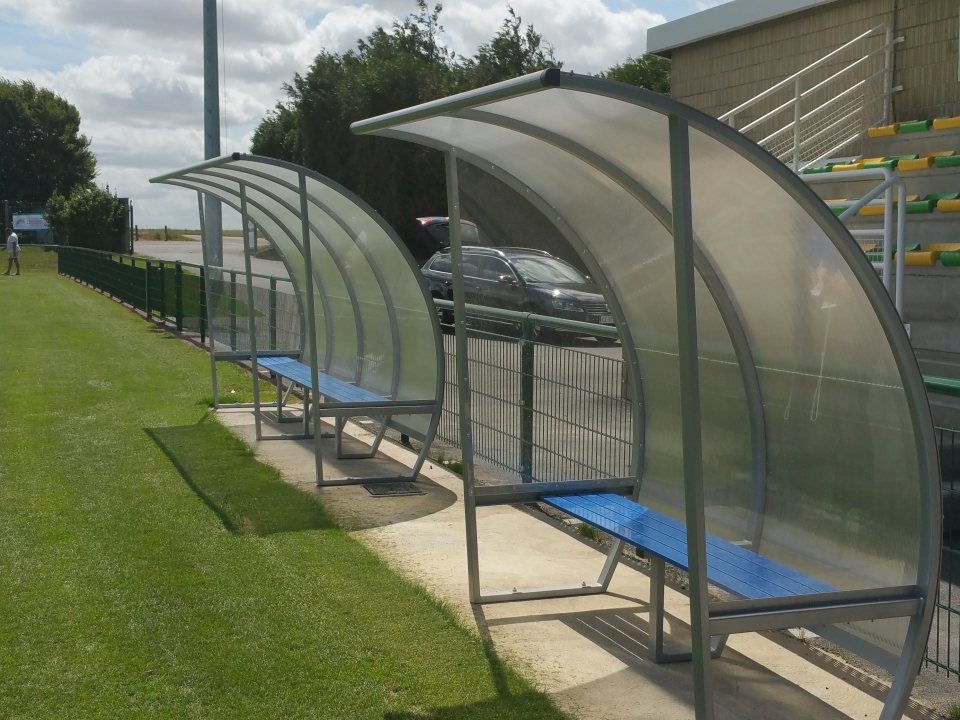 Aluminium-Spielerkabine. Der obere Bügel mit gebogenem Profil beugt Kopfverletzungen vor. Verstärkte Aluminium-Sitzschiene. (PVC-Sitz mit oder ohne Rückenlehne auf Anfrage). Lieferung inklusive Verankerungszubehör.